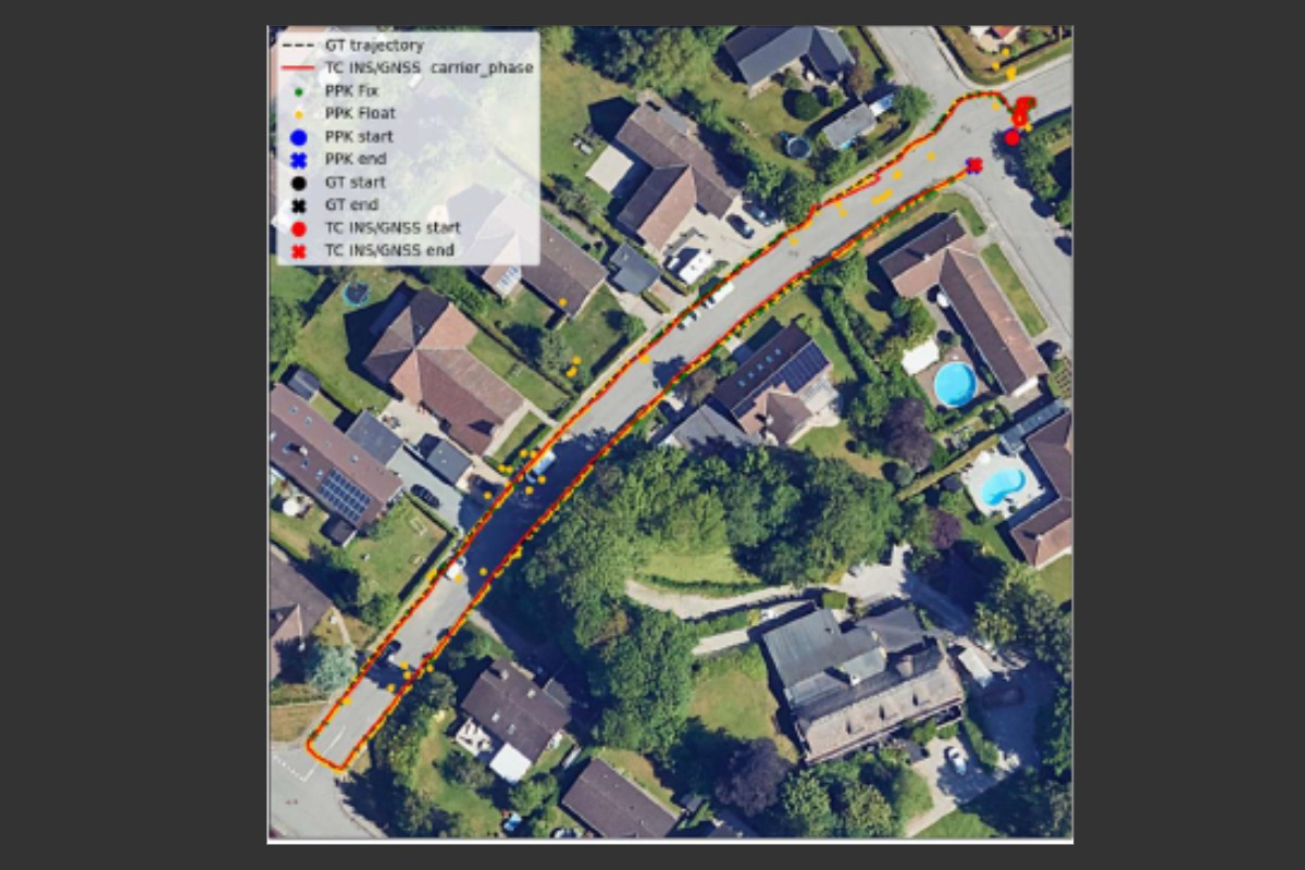 Test data illustrates how GNSS positions drift away from the pavement, even though the robot was driving steadily. When GNSS is combined with an IMU (Inertial Measurement Unit) – a motion sensor measuring acceleration and rotation – the position becomes significantly more stable.